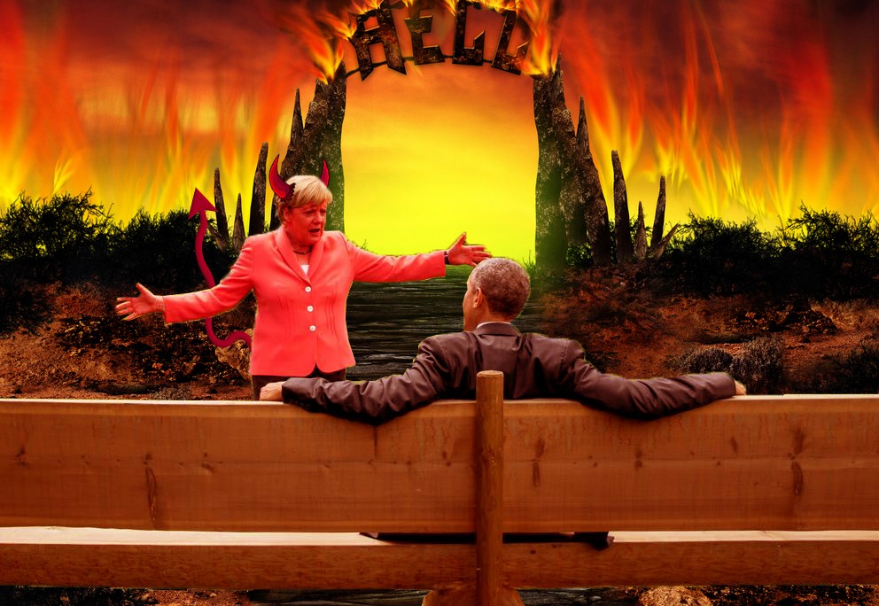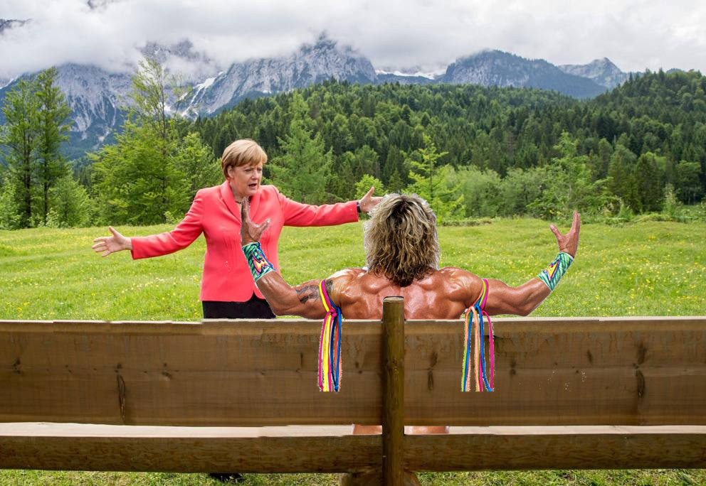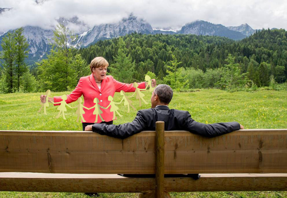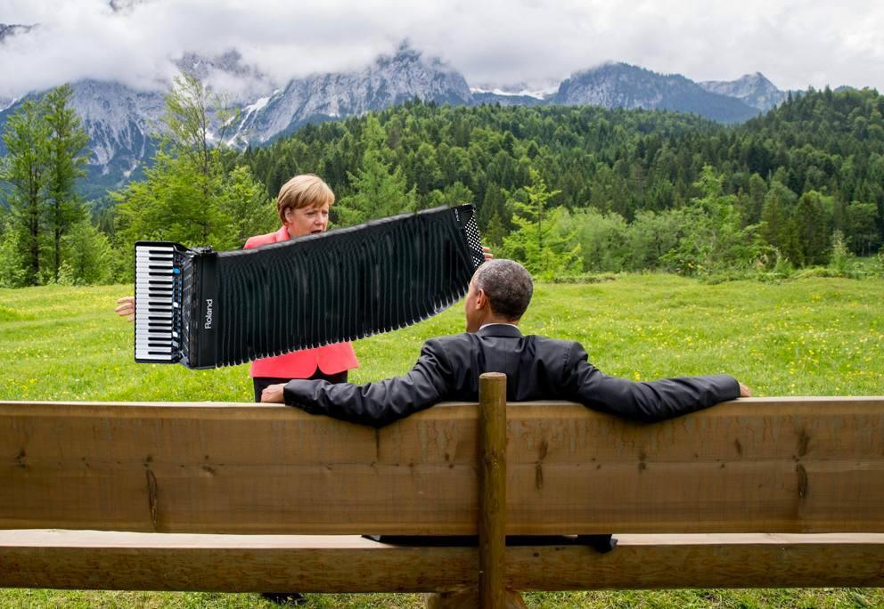 No solo el México nos mofamos de los gobernantes, pues en la reunión del grupo de los 7 o G7 que se reúne en Alemania, una escena de descanso y platica entre Barack Obama y Angela Merkel, ha causado furor en las redes sociales de los países asociados al grupo, el hecho por sí solo no dice nada, pero la pose que el presidente norteamericano tiene, como listo para recibir un privado de table dance y el ademan de la líder alemana fue material para memes.