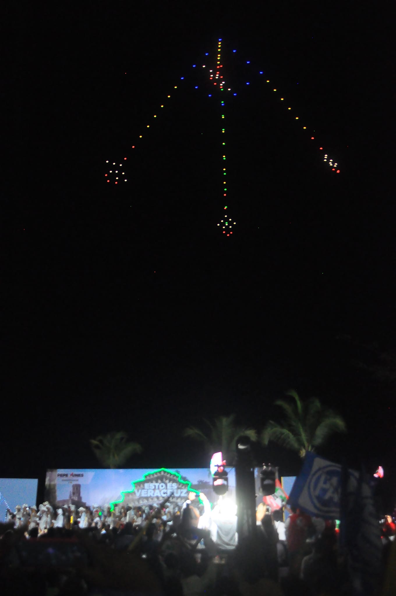 Finalmente, con un espectáculo de drones y pirotecnia, ante la admiración de los presentes, Pepe, saludó a todos sus aliados, reafirmando su compromiso con los veracruzanos «Por que yo si soy veracruzano».